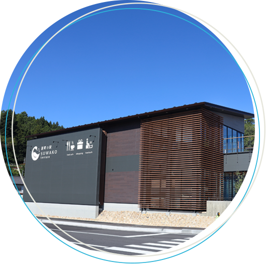 諏訪湖テラスは目の前に諏訪湖が広がり、その先に見えるのは雄大な八ヶ岳などの山々、 風光明媚で自然に取り囲まれたレイクリゾート施設です