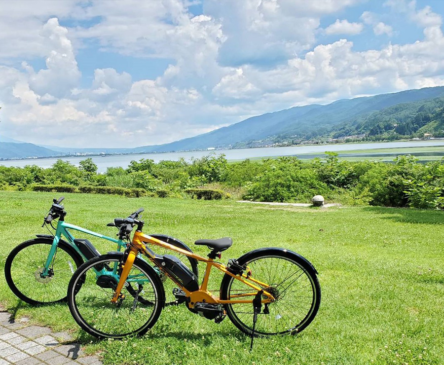 目の間に広がる諏訪湖には、湖畔をぐるりと一周できるサイクリングロードが整備されています。アップダウンのない湖畔のサイクリングは爽快そのもの。諏訪湖テラスではレンタサイクルをご用意し、お気軽にお楽しみいただけます。