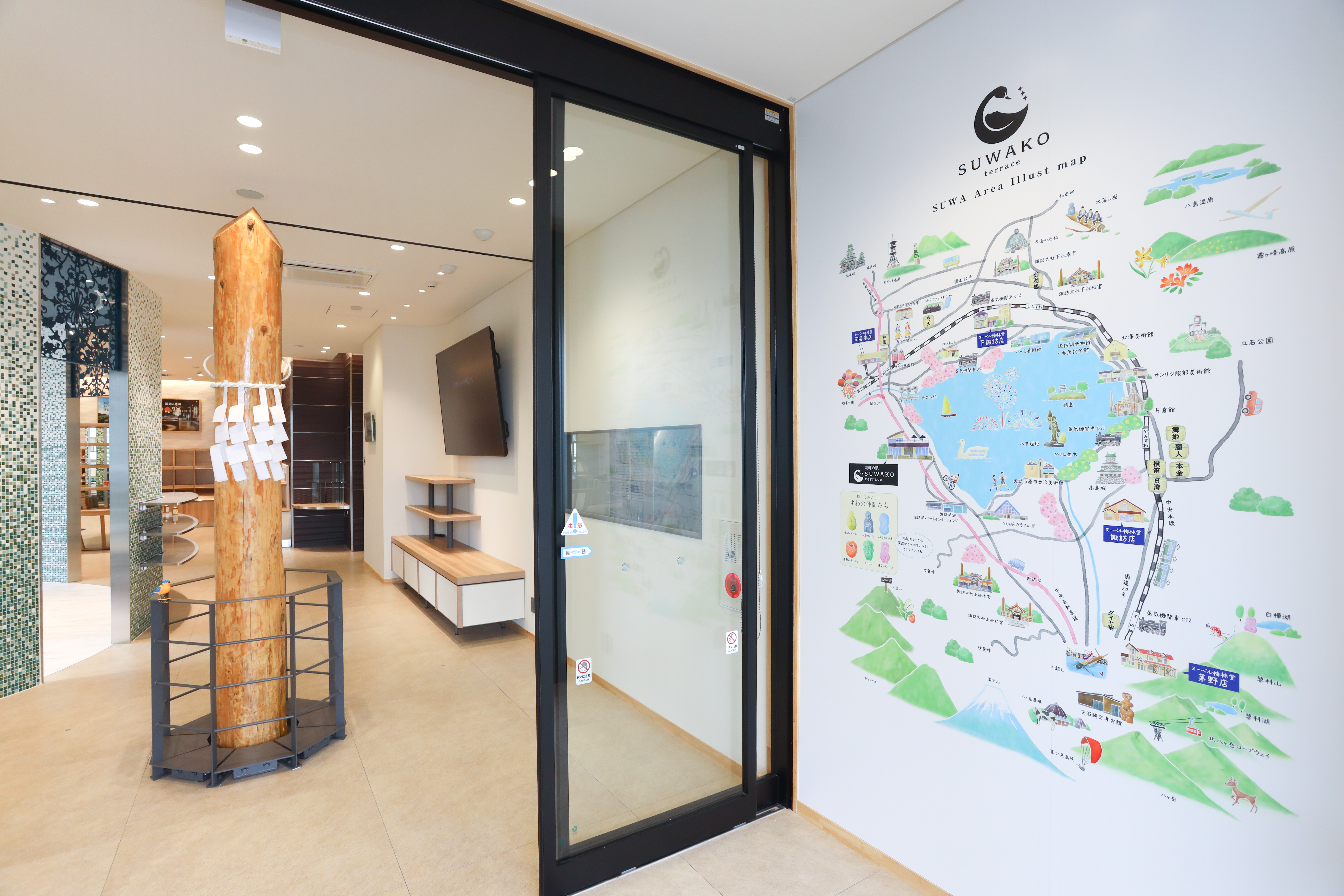 諏訪湖周辺は、諏訪大社や上諏訪温泉をはじめ、名所旧跡や美術館、博物館など、多くの見どころが点在しています。諏訪湖テラスの入口には、大きな観光マップを設置するとともに、周辺市町村の観光パンフレットをご覧いただけるタブレットもご用意。周辺観光のベースとして、最新の情報をご提供いたします。