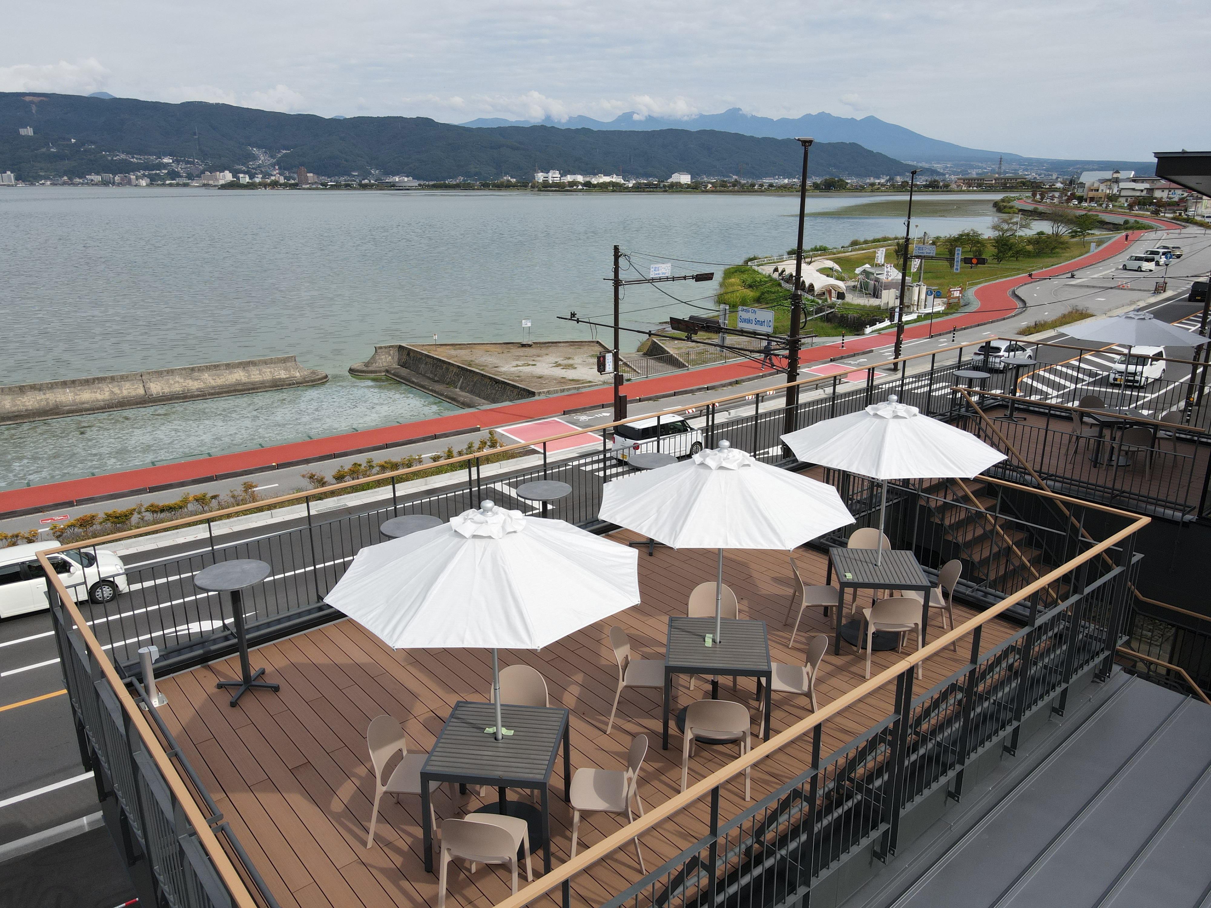 開放的で広々とした空間が自慢の2階の展望テラス。眼前には信州で一番大きな湖でもある諏訪湖が、正面には標高2,899mの赤岳を主峰に南北に峰々が連なる八ヶ岳が一望のもと。四季折々に美しい景観をお楽しみいただけます。また、店内でご購入いただいたお飲み物や軽食なども、展望テラスでお召し上がりいただけます。